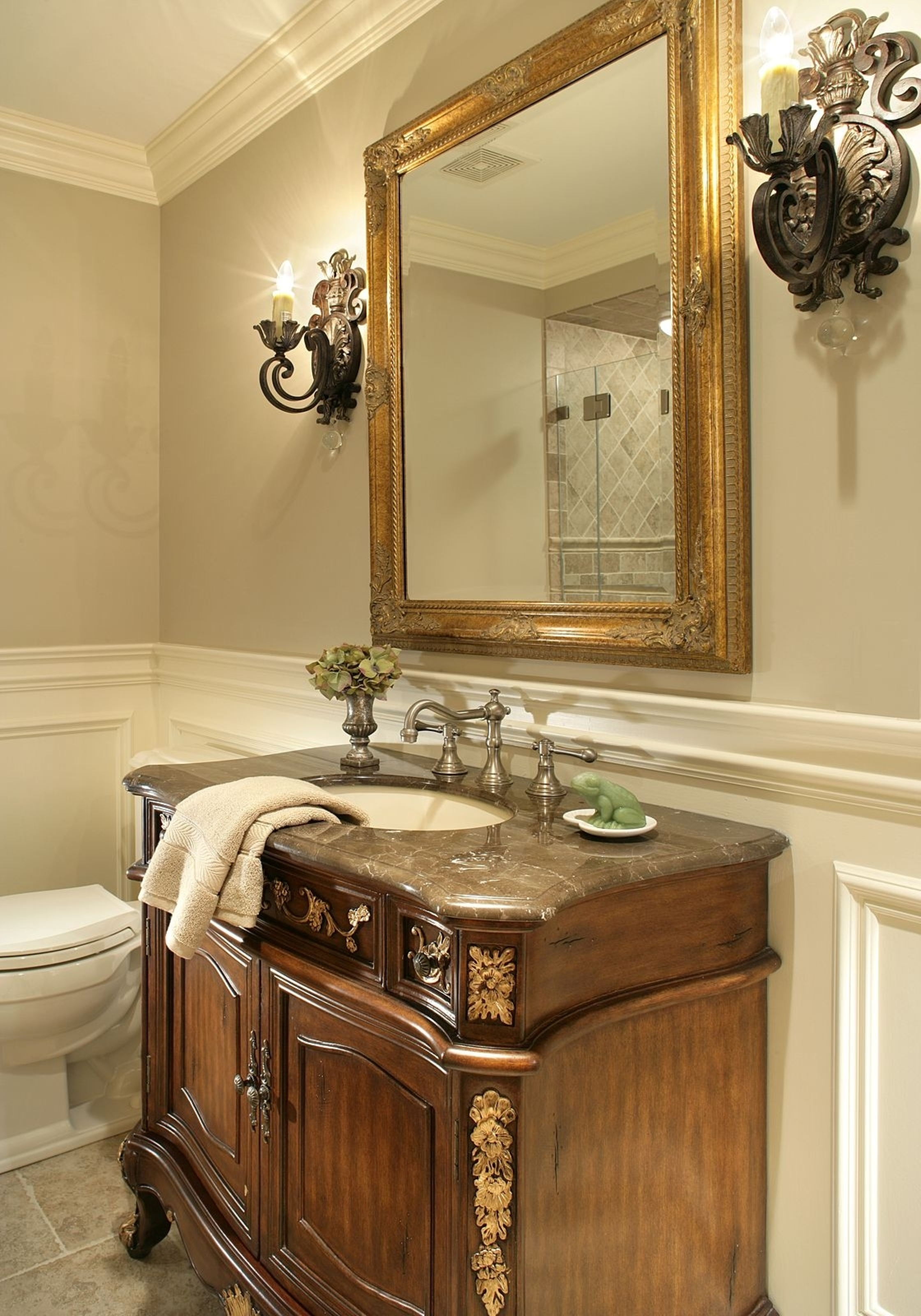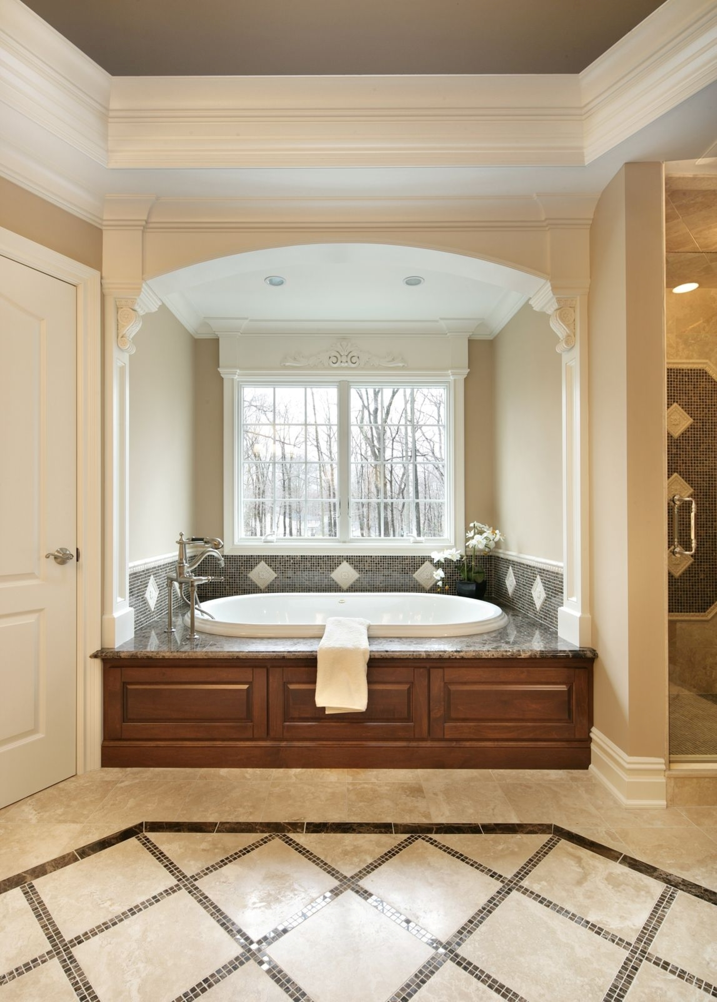 From diamond-pattern floors to paneled woodwork and sculpted trim, this bath reflects classical craftsmanship at its best