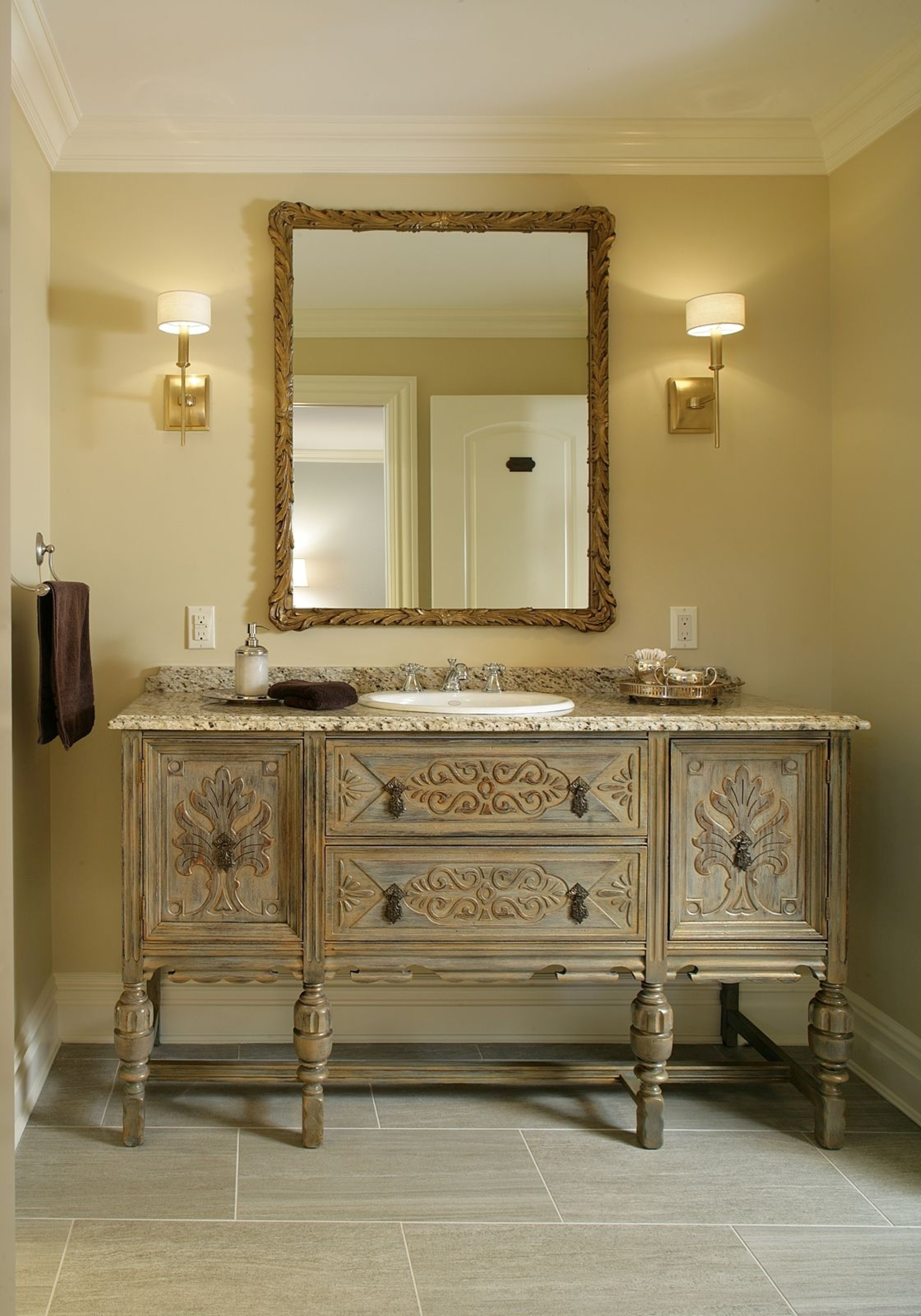 From acanthus carvings to softened finishes, this vanity anchors the room with quiet heritage and curated craftsmanship