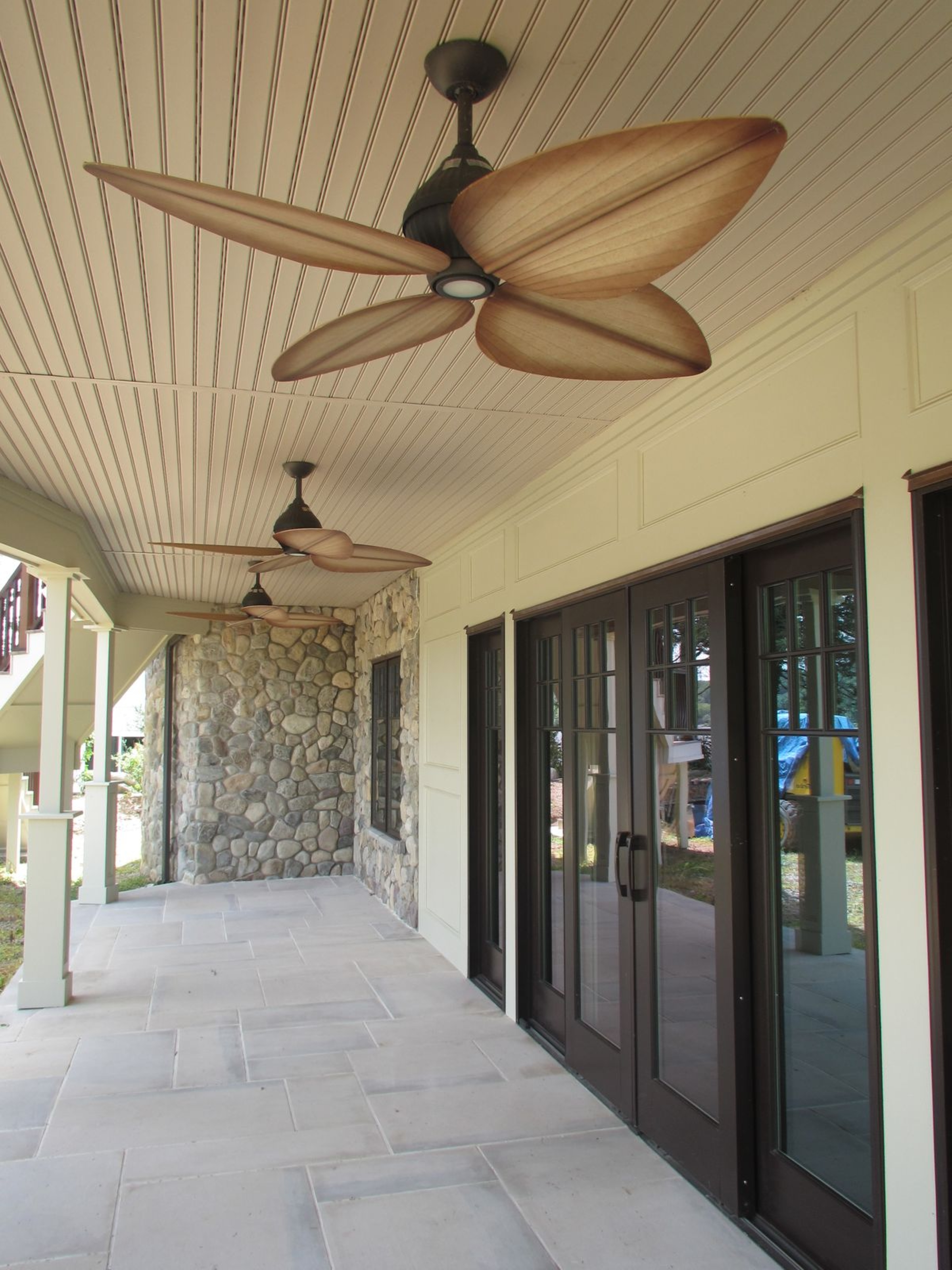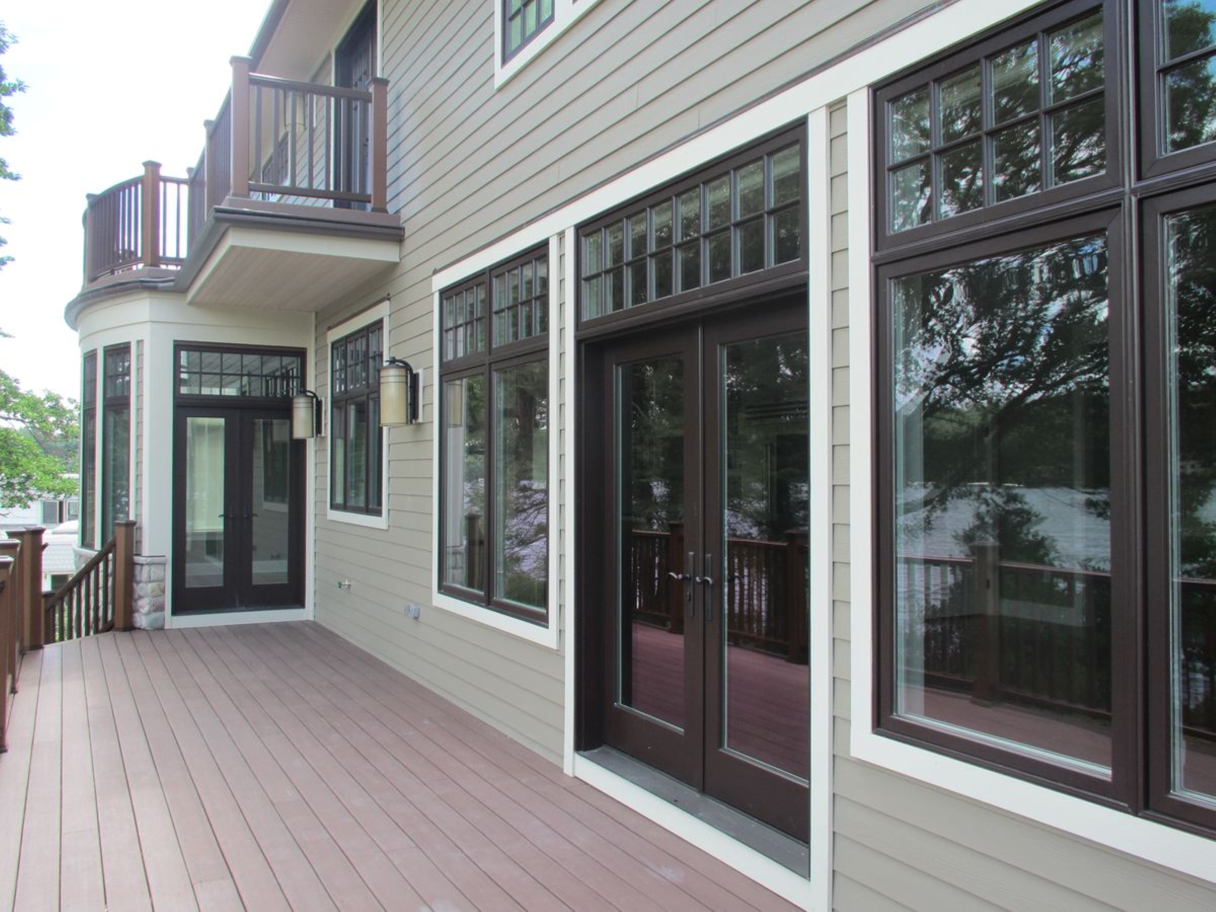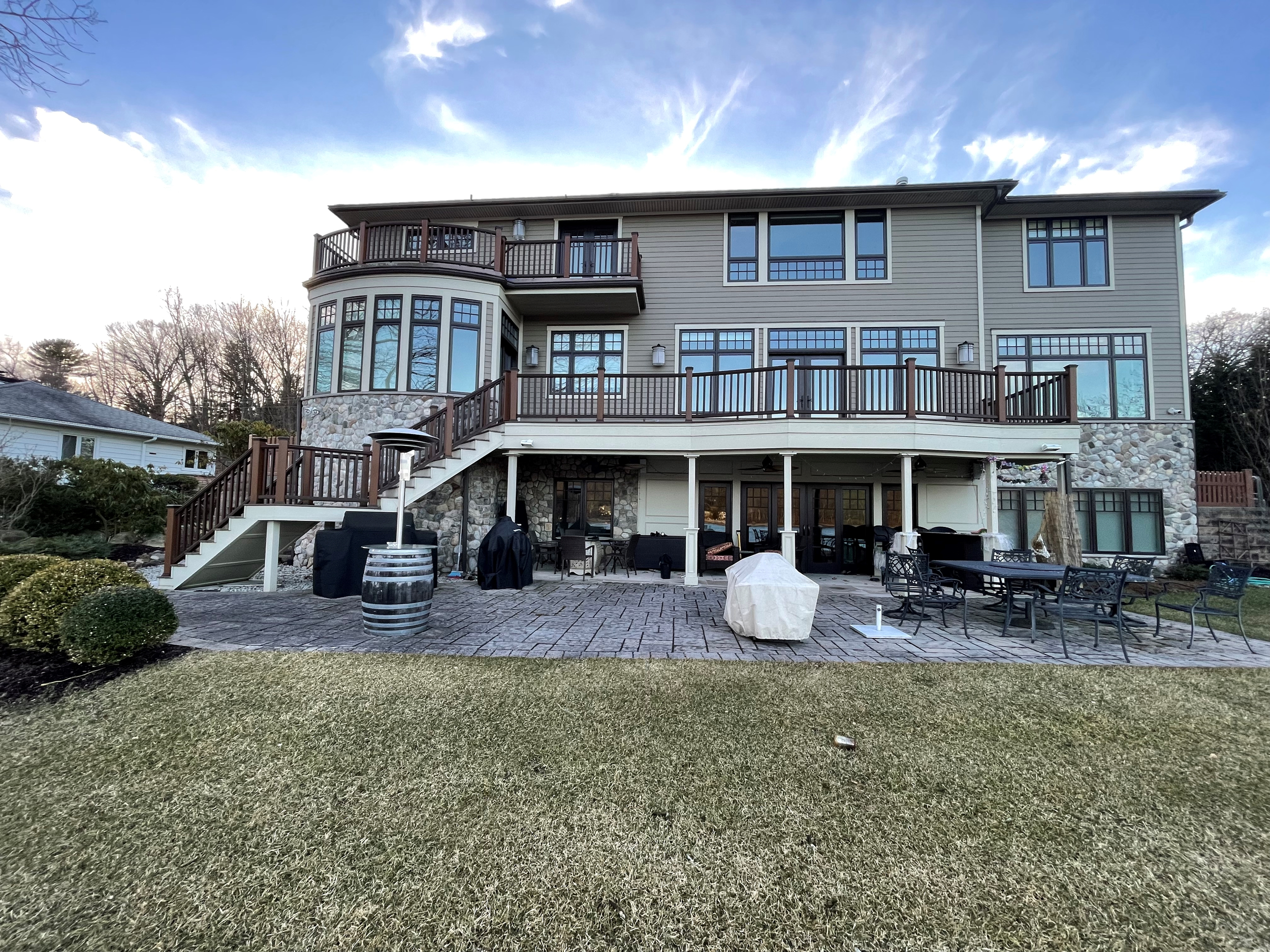 The master suite’s fiberglass deck sits above a Trex RainEscape system with a center-platform wrap around staircase and composite railing. Below, a bluestone patio with craftsman posts and PVC panelled wainscot meets river-stone veneer for a grounded, low-maintenance base