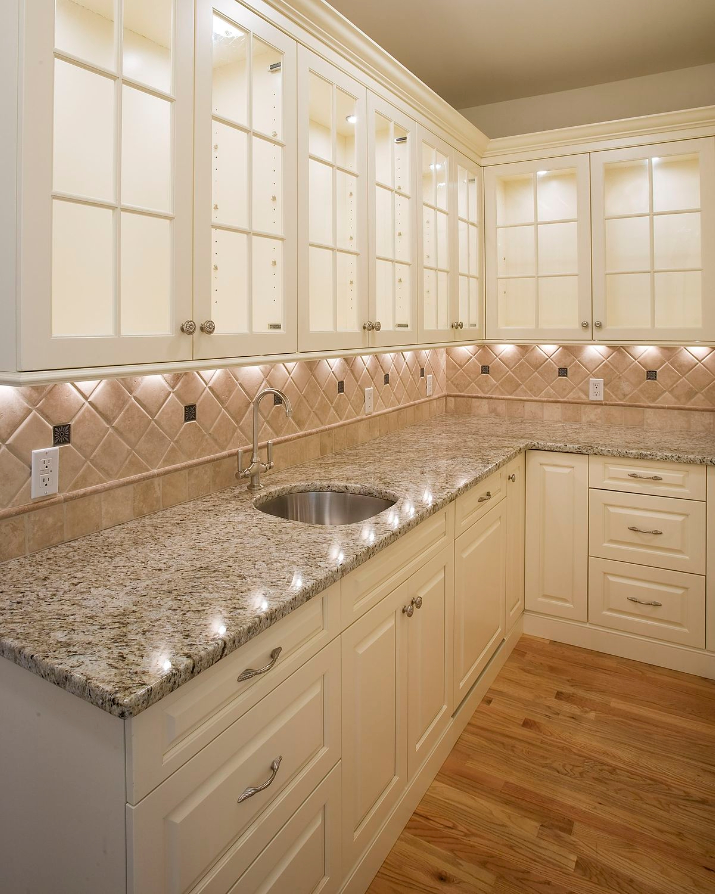 This kitchen showcases a refined blend of transitional elegance and light-enhancing design. Upper cabinetry with divided-lite glass doors offers museum-style display framing, paired with interior downlighting that creates a glowing gallery effect. The full L-shaped layout is wrapped in cream-colored cabinetry with soft beveling and polished chrome hardware, while the countertops are speckled granite with warm neutral tones and understated veining. The diagonal tile backsplash features tumbled travertine and decorative metal insets—forming a diamond pattern that adds both texture and classical symmetry. A round undermount prep sink offers functionality in a secondary or butler’s kitchen context. The intentional lighting layout emphasizes the perimeter line, echoing the ceiling’s recessed tray detail. Altogether, it’s a space built with care for the little things—craftsmanship that whispers rather than shouts.