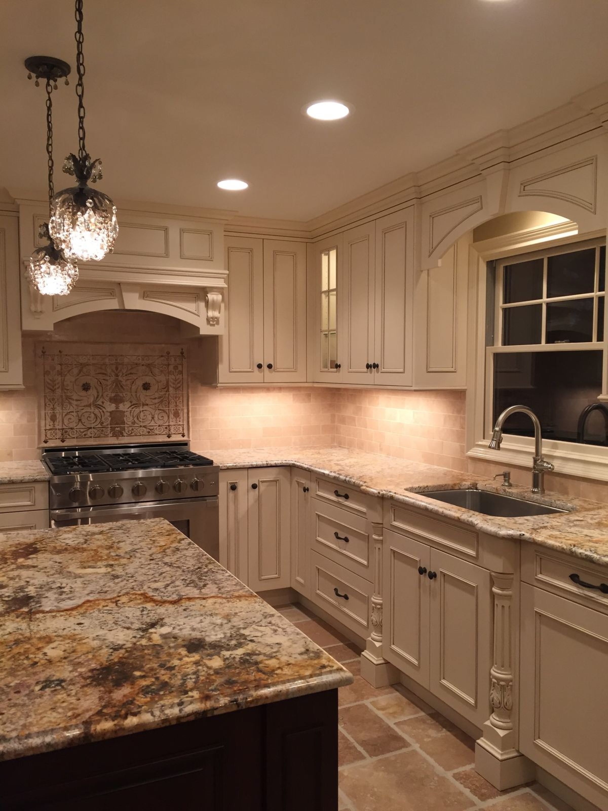 This kitchen exemplifies European-inspired classical design, rendered with the attention to detail that defines architectural-grade remodeling. Cream-colored raised panel cabinetry features ornate applied molding, decorative corbels, and inset detailing reminiscent of traditional French or Italian joinery. The granite countertops are richly veined, with warm tones of ochre, gold, and deep rust—creating a dramatic visual centerpiece on both the perimeter and the island. The backsplash tile is hand-cut limestone in a subtle blush-beige, grounding the room in earth tones. A carved tile focal point above the range continues the old-world motif. Rounded crown molding, arched valances, and chandelier-style pendant lights layered with crystal pendants give the space a sense of curated luxury. This is a kitchen made to feel lived-in yet timeless—equal parts romance and rigor, built for both beauty and everyday function.