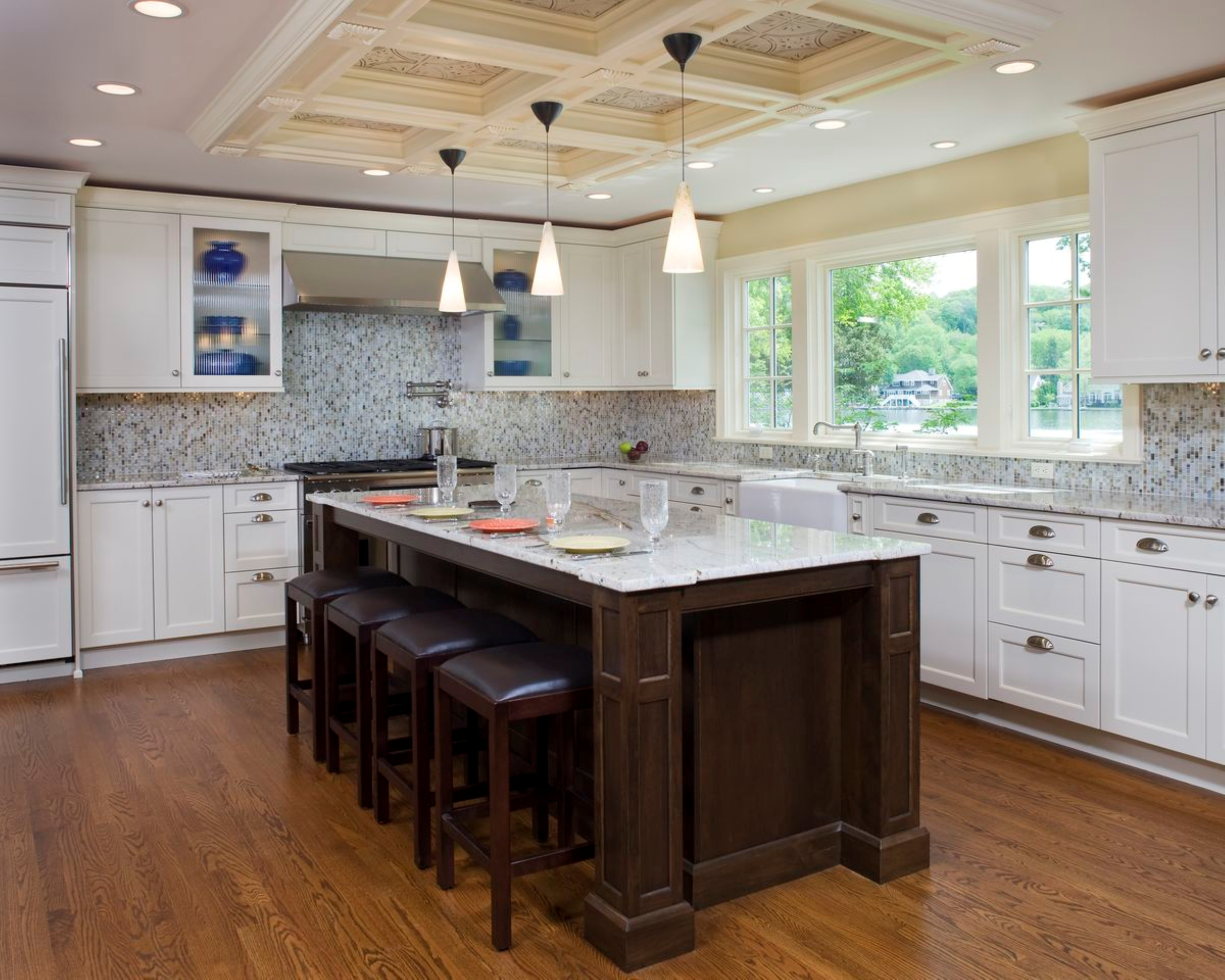 This kitchen remodel unites coastal brightness with refined architectural presence. The standout feature is the coffered ceiling—ornately detailed with recessed panels and crown molding, creating classical vertical depth. Below, a crisp white Shaker-style cabinet system is paired with a sleek mosaic tile backsplash in pearlescent tones of blue, gray, and champagne—evoking a shimmering oceanic feel. A wide apron-front farmhouse sink sits under a triple-paneled window, flooding the space with natural light and Lowcountry views. The central island anchors the room with dark stained wood and rectangle inlay column detailing, offering both seating and storage. Pale granite countertops with soft veining maintain elegance without overpowering. Pendant lighting and concealed appliance panels enhance the seamless look. This kitchen is the embodiment of elevated coastal living—designed for beauty, built for life.